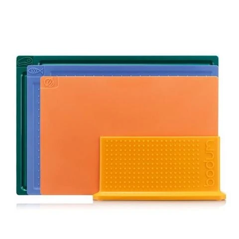 When not in use, these colorful chopping boards stand upright in a rubber-coated holder, which allows air to circulate between the boards keeping them nice and fresh, while taking up minimal space on your kitchen counter.
