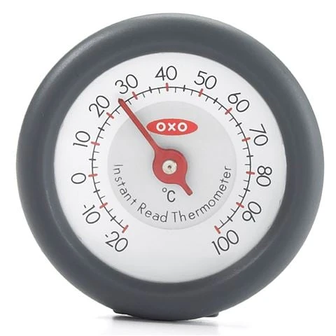 Don’t guess: Get a quick and accurate internal temperature with the OXO Good Grips Analog Instant Read Thermometer. Our thermometer has a rapid-response coil to give you a speedy readout. The shaded area on the probe serves as a guideline for proper insertion depth, and the large display makes at-a-glance reading easy. The probe’s storage sleeve includes a handy list of chef- and USDA-recommended temperatures for common meats.