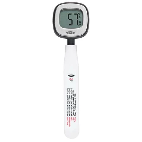 The Chef’s Precision line of thermometers offers professional-grade results with at-home ease. The Instant Read Thermometer provides quick, accurate measurements in large, easy to read numbers (°C and °F) for cooked meat by simply inserting the probe.