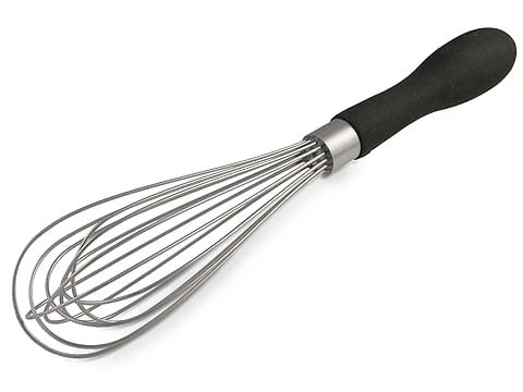 The Oxo Good Grips Whisk features polished stainless steel wires and a teardrop shaped handle that fits comfortably in the palm of your hand. The soft handle won’t slip out of your hand, even when wet. Beat eggs, stir batter, whip cream and stir sauces in comfort.