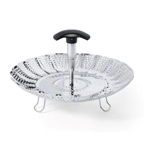 The Oxo Stainless Steel Steamer with Extendable Handle, provides an added length for easy and safe use in hot pots. Press the handle again to lock it down and fold feet in for compact storage. The handle also includes a utensil slot to lift the steamer out of pots. Itβs dinner prep on a whole new level.