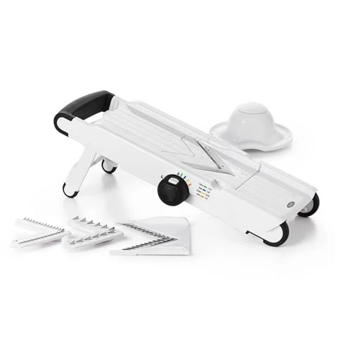 Use any of the four blades and height adjuster to perfectly slice or julienne fruits and veggies using the V-Blade Mandoline Slicer. The textured surface keeps food from sticking, while the food holder securely holds food and protects fingers. Feet fold up and Mandoline locks for safe storage.
